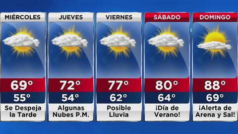 Luego de varios días lluviosos el cielo se despeja un poco, pero en horas de la tarde. La temperatura máxima será de 69 grados, y en la noche baja a los 55 grados y vuelve la nubosidad....Seguir leyendo univision