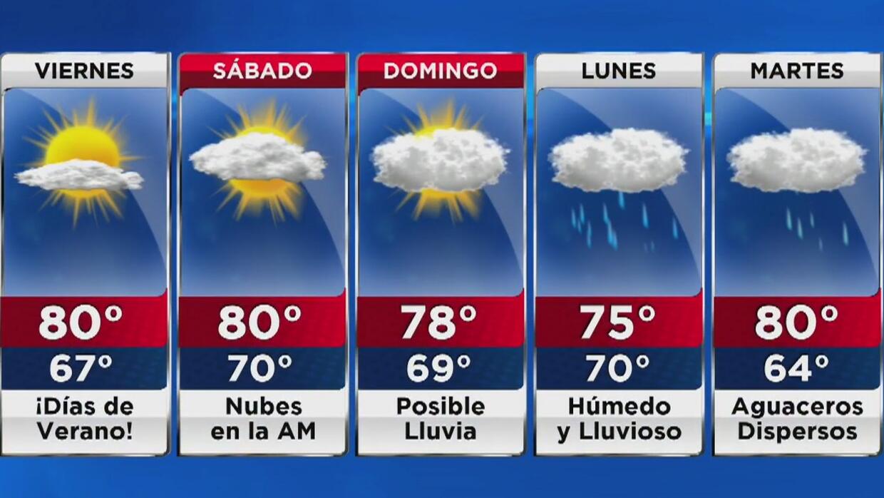 El día inicia con temperatura moderada, pero subirá hasta llegar a 80 grados en la tarde. El cielo estará nublado en algunas horas del día, con probabilidad de lluvia. El fin de semana también habrá presencia de nubes....seguir leyendo .univision.